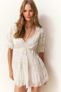 Introducing the Lilias Dress. This Victorian-inspired mini stuns with a cotton voile fabric. She features short sleeves, a square v-neckline, lace threaded through the waistline, and intricate vintage-inspired details all over. The dress is finished with a zipper.