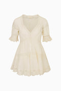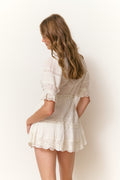 Introducing the Lilias Dress. This Victorian-inspired mini stuns with a cotton voile fabric. She features short sleeves, a square v-neckline, lace threaded through the waistline, and intricate vintage-inspired details all over. The dress is finished with a zipper.