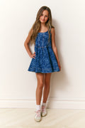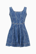Loving on the Liliette Dress. This playful denim dress features our signature Luna Rosa Beaux print lasered on to give it a feminine touch. The dress begins with tank straps above a form-fitting bodice that falls to an airy, pleated skirt.