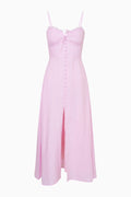 Loving on the Linella Dress. Designed from a crisp linen fabric, this must-have maxi was made for summer. Timeless and classic in all the right ways, this dress features thin spaghetti straps, bustier-inspired cups at the bust with shirring details, a playful keyhole cutout, a center front placket that stops at the hip above a flirty center front slit. The back is smocked for easy wear.