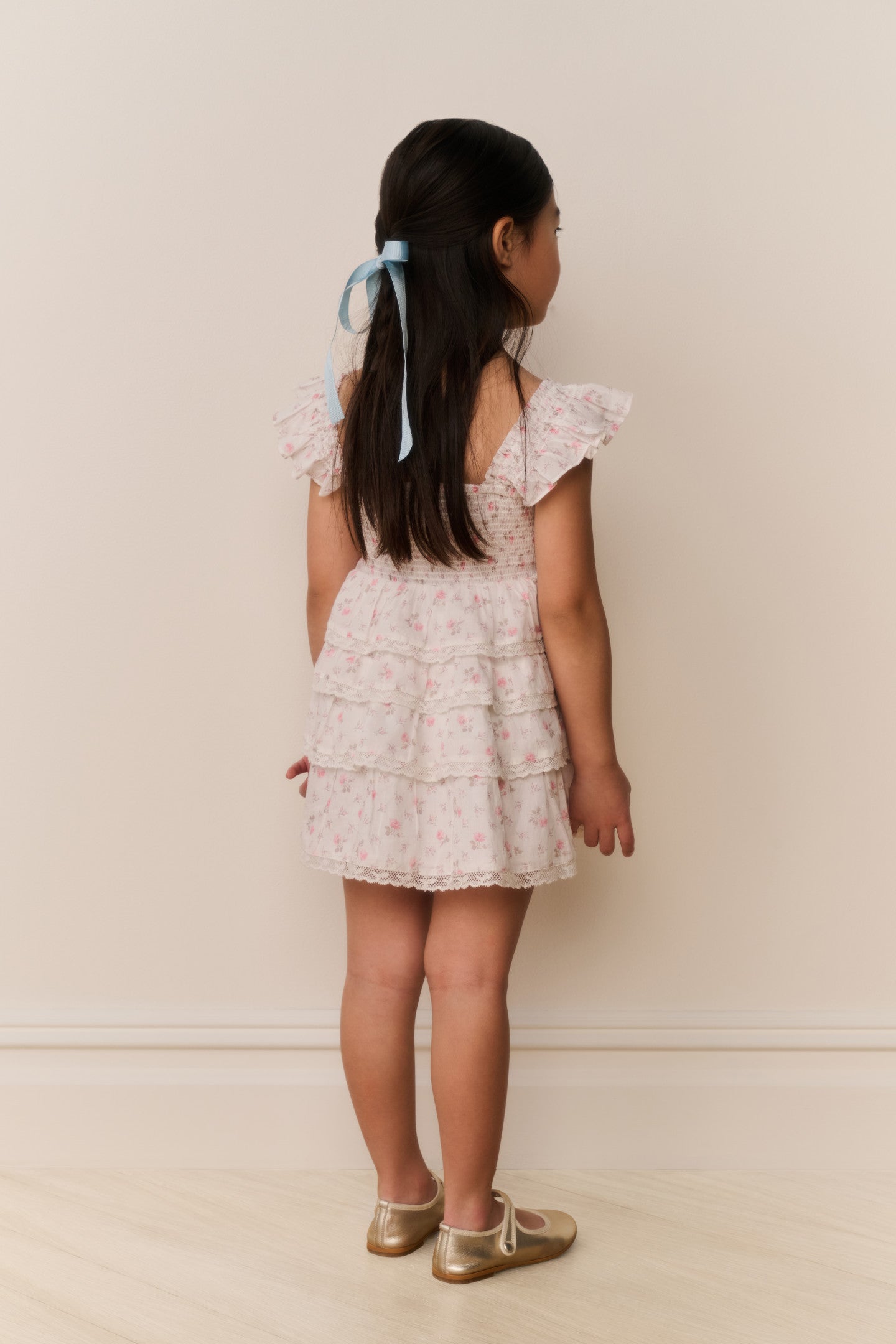 The Linoette Girls’ Dress is designed in a fit-and-flare silhouette with soft fabric for comfortable, all-day wear. Lace insets and scalloped trim detail the bodice, while a three-tiered ruffle skirt creates light movement. Finished with a floral print for a sweet touch.