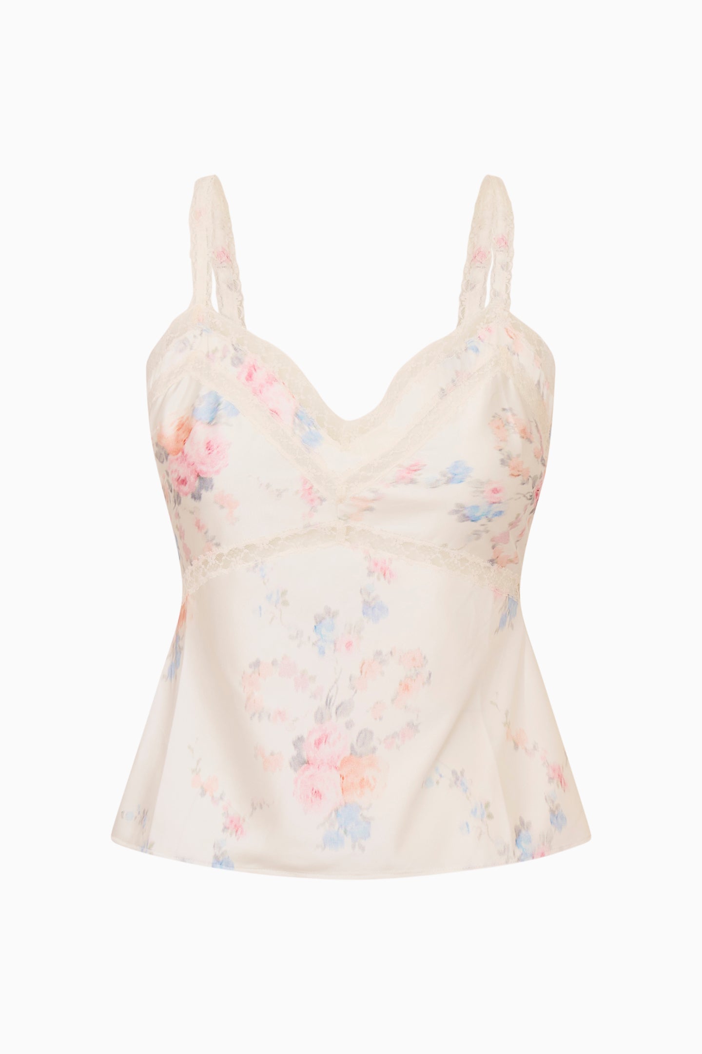 The Lirena Cami Top is crafted from lightweight satin fabric in a whimsical floral pattern. This V-neck top is adorned with delicate lace insets and slender spaghetti straps, making it a versatile staple for layering or wearing on its own.