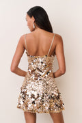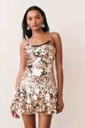 The Liria Dress is a celestial, art-deco-inspired mini made for holiday festivities. Designed from 100% nylon mesh and lined with soft georgette, it features a scoop-neck, spaghetti strap silhouette adorned with gold metallic sequins in scalloped, architectural patterns. The swing-and-flare hem creates graceful movement, while all embellishments are hand-applied for meticulous detail. A shimmering, festive mini that dances with light and elegance at every celebration.