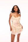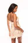 The Lomina Dress returns as part of our Heirloom Print Capsule featuring our signature Ibiza Sunset print made-to-match with our Hair & Body Perfume Mists. The mini version of our best-selling Rialto Dress, the Lomina returns with a lightweight chiffon fabric featuring a delicate, gold fil coupe with our signature bow design all over giving this piece a textural clip detail. The flirty piece stuns with overlapping, asymmetrical ruffles at the neckline that descend through the slightly fitted skirt.