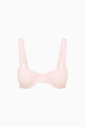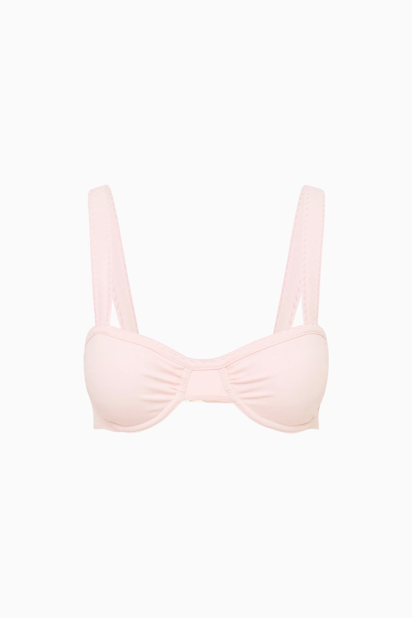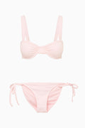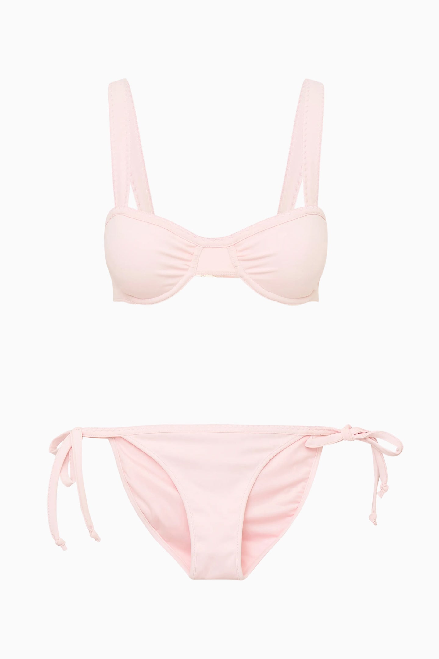 A feminine, elevated swim set trimmed with delicate embroidery for a signature LoveShackFancy touch. The bra-style top features supportive underwire, removable cups, and wider adjustable straps, plus subtle ruching at the center front. The matching bottom is finished with a sweet self-tie detail at the sides and embroidery along both the front and back edges.