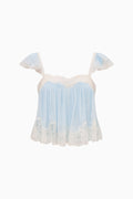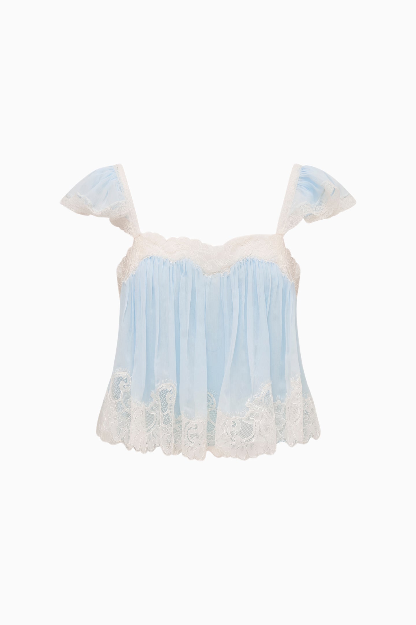 The Lova Top is a lightweight, bohemian cami crafted from flowing silk chiffon. Designed in a flutter-sleeve trapeze silhouette that hits just below the natural waist, it features scalloped lace at the neckline and hem, lace straps, and a softly A-line shape created by shirring throughout. Effortless, airy, and perfect for warm-weather styling or vacation looks. Pair with the Jolina Skirt for a full set.