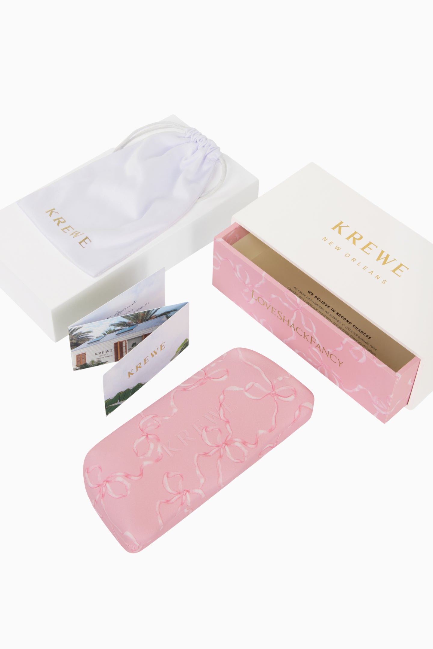 All LoveShackFancy X KREWE frames purchased at full-price through either retailer qualify for KREWE's Second Chances Warranty.