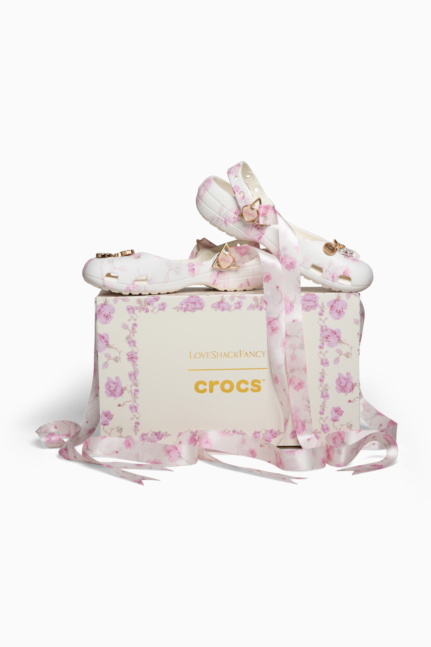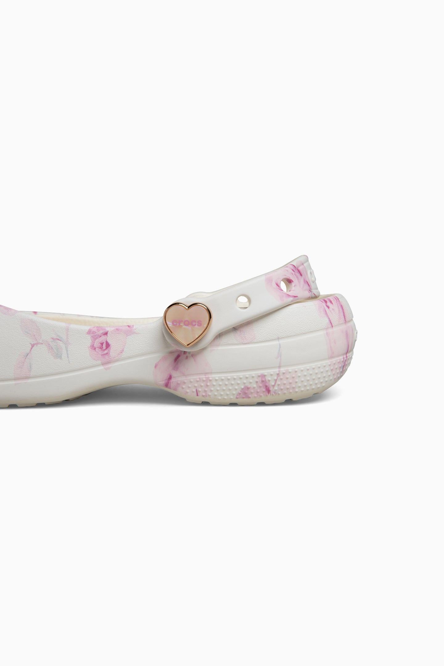 The LoveShackFancy Classic Ballet Flat is a graceful silhouette that has a soft, cushioned footbed for comfortable all-day wear. Soft pink tones are accented with a vintage inspired floral print. Delicate satin ribbons can be added to the shoes rivets and wrapped up around the calves for a romantic classic ballet aesthetic. Four exclusive Jibbitz charms personalize the upper with an additional Jibbitz chain for an elevated look of sophistication.