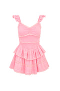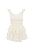 Loving on the Lovine Dress. This medium weight dress debuts with a striped cotton dobby fabric giving it an elevated texture. Delicate, vintage-inspired laces are stripped throughout the body. The piece begins with short, elasticated flutter sleeves above a slightly v-neckline that falls to smocked bodices which releases into a cute, two-tiered skirt.
