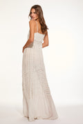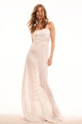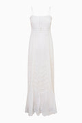 Loving on the Lucina Dress. This Victorian-inspired maxi debuts with a stretchy cotton voile, ultra-lightweight fabric. The floor-length piece has a sophisticated A-line shape with a body-skimming silhouette and spaghetti straps.