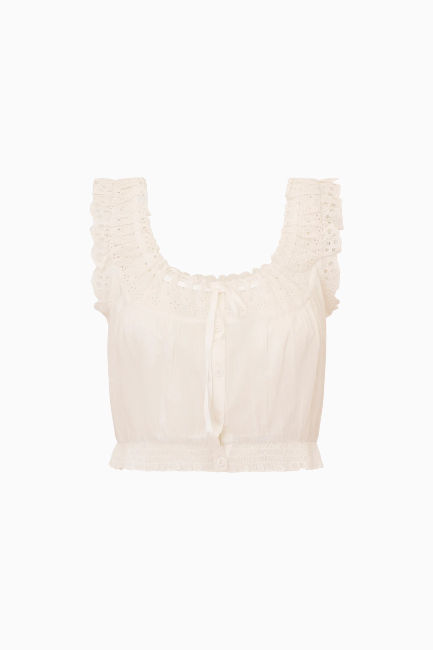 Designed in cotton voile, this cinched crop top features heart eyelet embroidery along the neckline and a satin ribbon threaded through the trim. A sweet seasonal nod to Valentine’s Day.