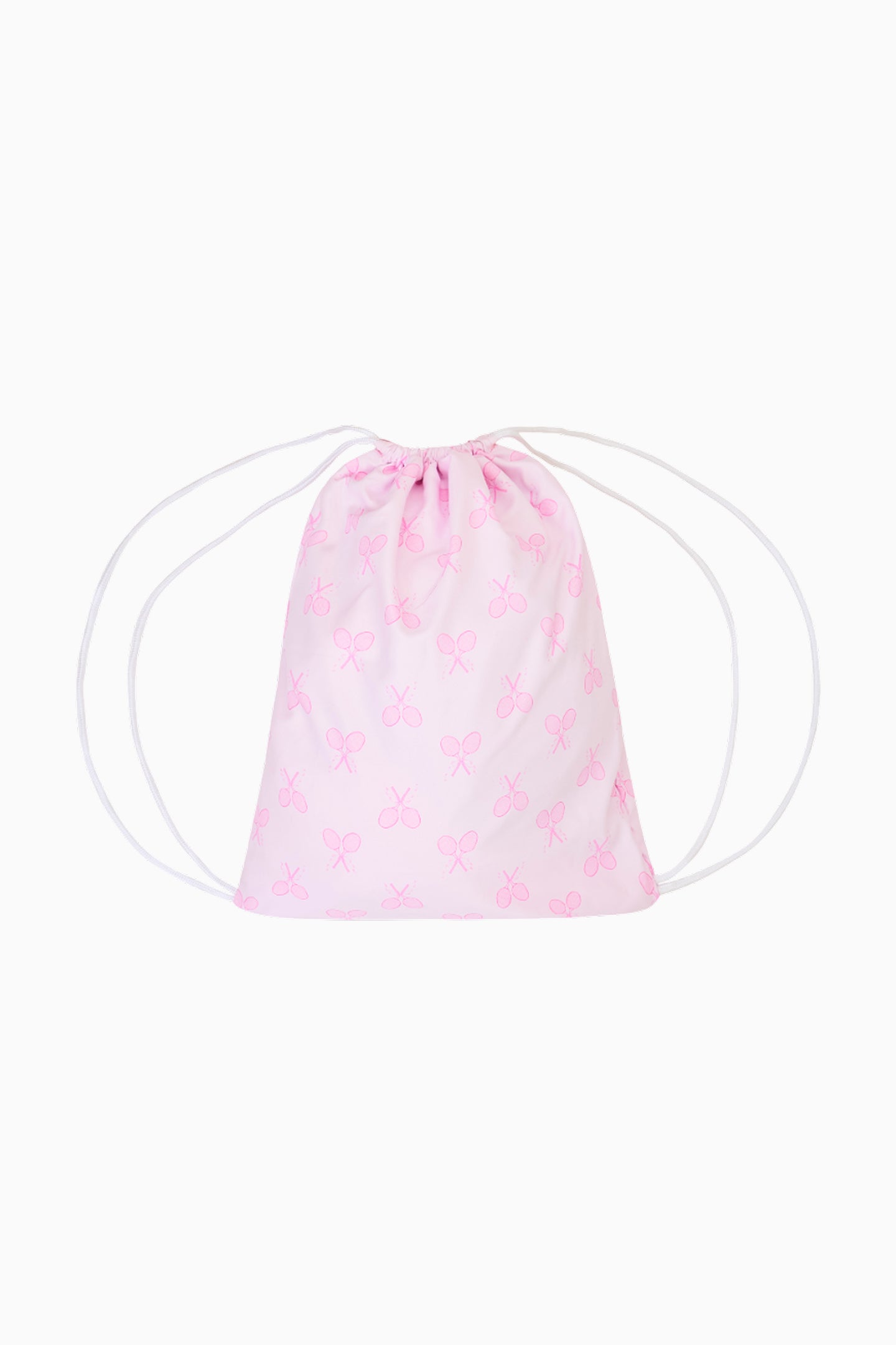 Keep your essentials close and cute with our Madora Bag. This easy piece features our tennis racquet print in pink and drawstring straps for easy open and closure.
