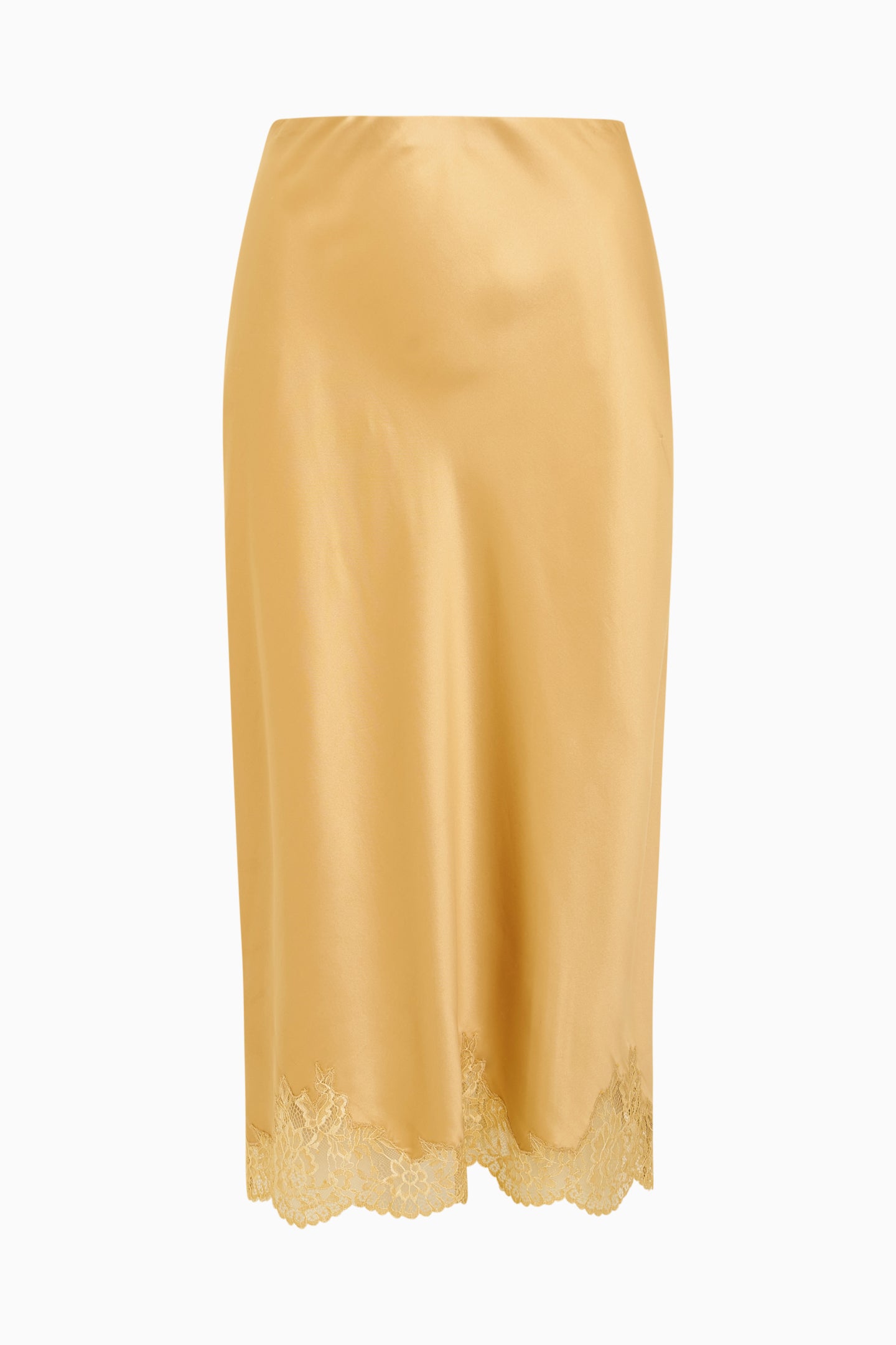 Effortlessly chic in the Malina Skirt. This dreamy slip returns with a luxe silk charmeuse, drapey fabric. Easy to pull on, the midi skirt features elastication for comfort. This piece is finished with a scallop, delicate lace hem for a romantic look. Pair with the Brimsley Top for a full set.