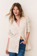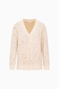 Introducing the Mar Cardigan. This unique knit arrives with a warm, wool cashmere blend featuring metallic gold yarn woven throughout in a jacquard pattern of celestial motifs. This piece has a pretty shimmer amongst a classic, oversized, boyfriend shape and is finished with our custom faux shell LoveShackFancy buttons, and ribbed trim pockets.