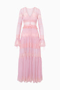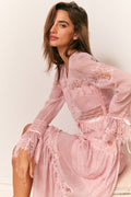 Ethereal and effortlessly feminine, the Marinetta Dress is a shorter maxi that grazes the ankle, designed to float with every step. Designed from delicate crinkle chiffon, this dreamy piece features a V-neckline with faux buttons down the front and a hidden zip for easy wear. Sheer laced panels at the chest, sleeves, and waist add a touch of romance, while the rest of the dress is fully lined for comfort and coverage. Satin bows at the sleeves and waist punctuate the silhouette with charming, flirty details. Perfect for sunlit strolls or evening soirées, the Marinetta Dress brings a whimsical, boho-inspired elegance to any occasion.