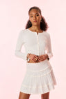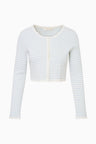 Introducing the Media Cardigan. This lightweight layer debuts with our best-selling pointelle yarn with a nice stretch and extra soft feel. With an all-over rib pointelle, the cardigan has little stripes knitted throughout with lurex for our signature shimmer. The sweater has a slim crop fit, pointelle scallop edges, and a pointelle scallop placket adorned with our custom bow shell buttons down the front.