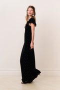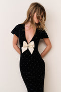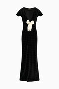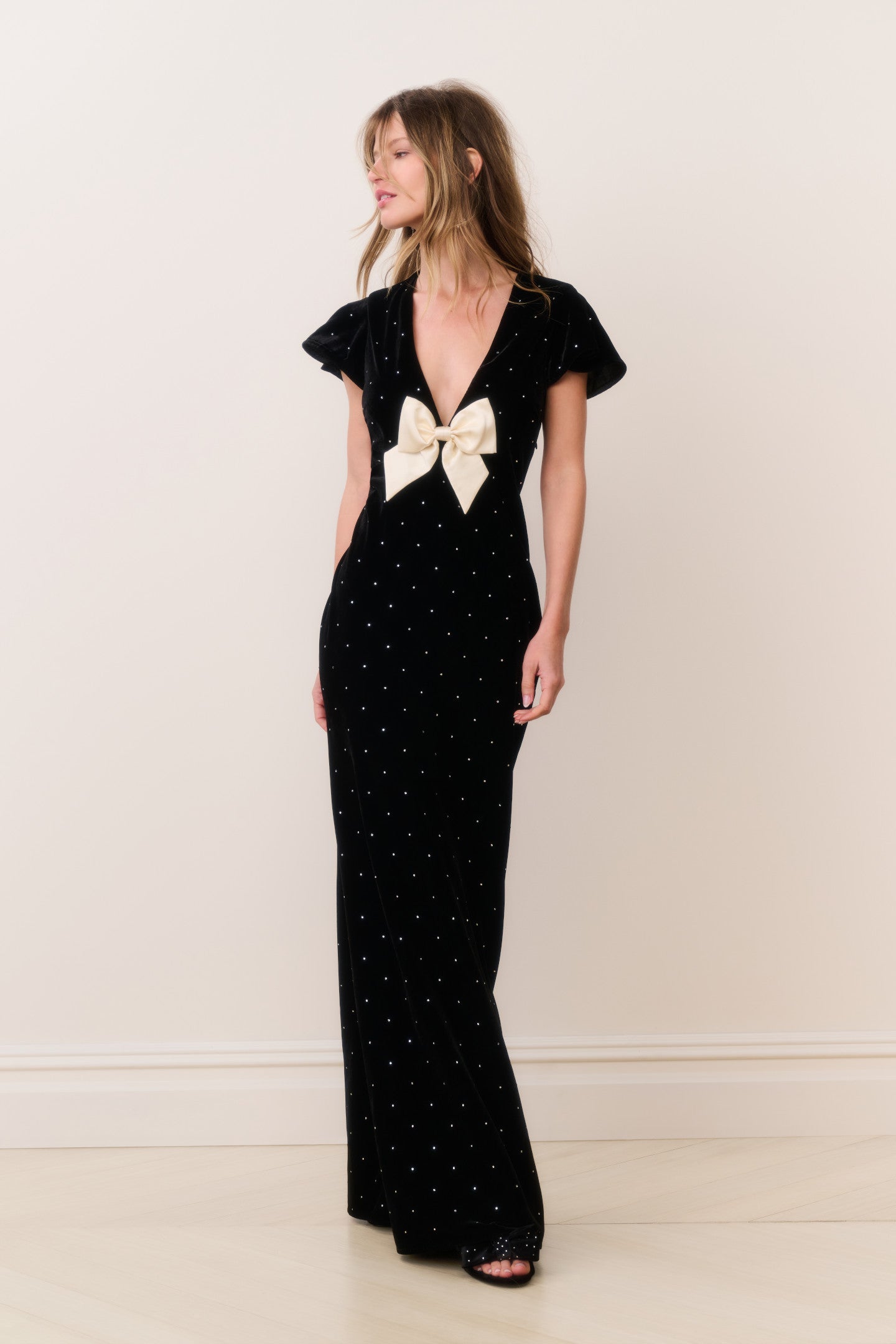 Festive and romantic, the Melora Dress makes its debut. Crafted from velvet with heat-fixed crystals, the dress shimmers subtly across the bias-cut fabric, highlighting its deep V-neckline and vintage-inspired butter sleeves. The empire waist and fishtail skirt create a graceful, flowing shape, while a soft ivory bow at the front neck adds a signature LoveShackFancy accent.