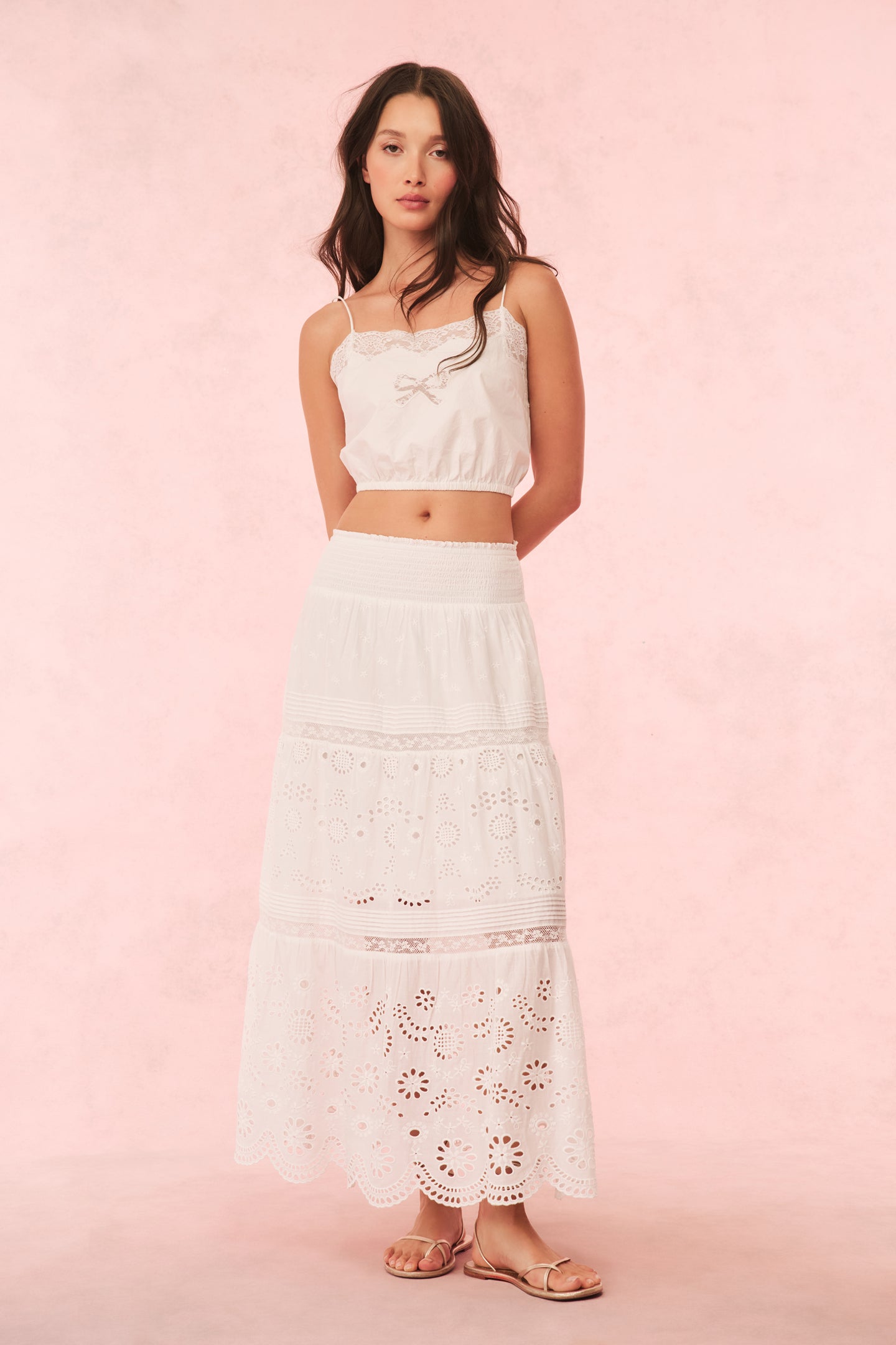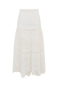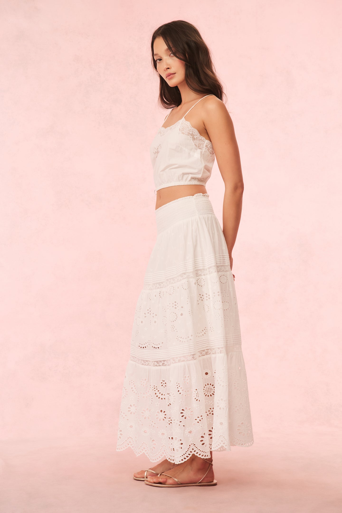 Introducing the Miloti Skirt. This cotton maxi skirt arrives with a beautiful medley of custom-made, large-scale scallop floral eyelet details mixed with smaller eyelets. The A-line skirt features smocking at the waist for elastication and comfort and a straight silhouette that releases into a fuller, eyelet skirt.