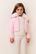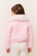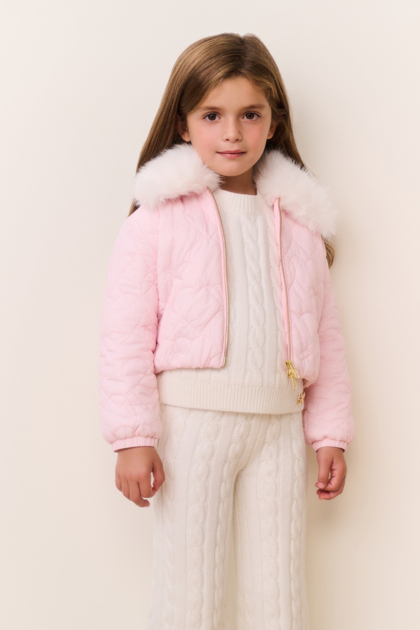 Introducing the Sandria Jacket. This charming puffer-like jacket features a cute heart motif embroidered throughout and a faux fur collar–a must-have layer for the cold weather season.