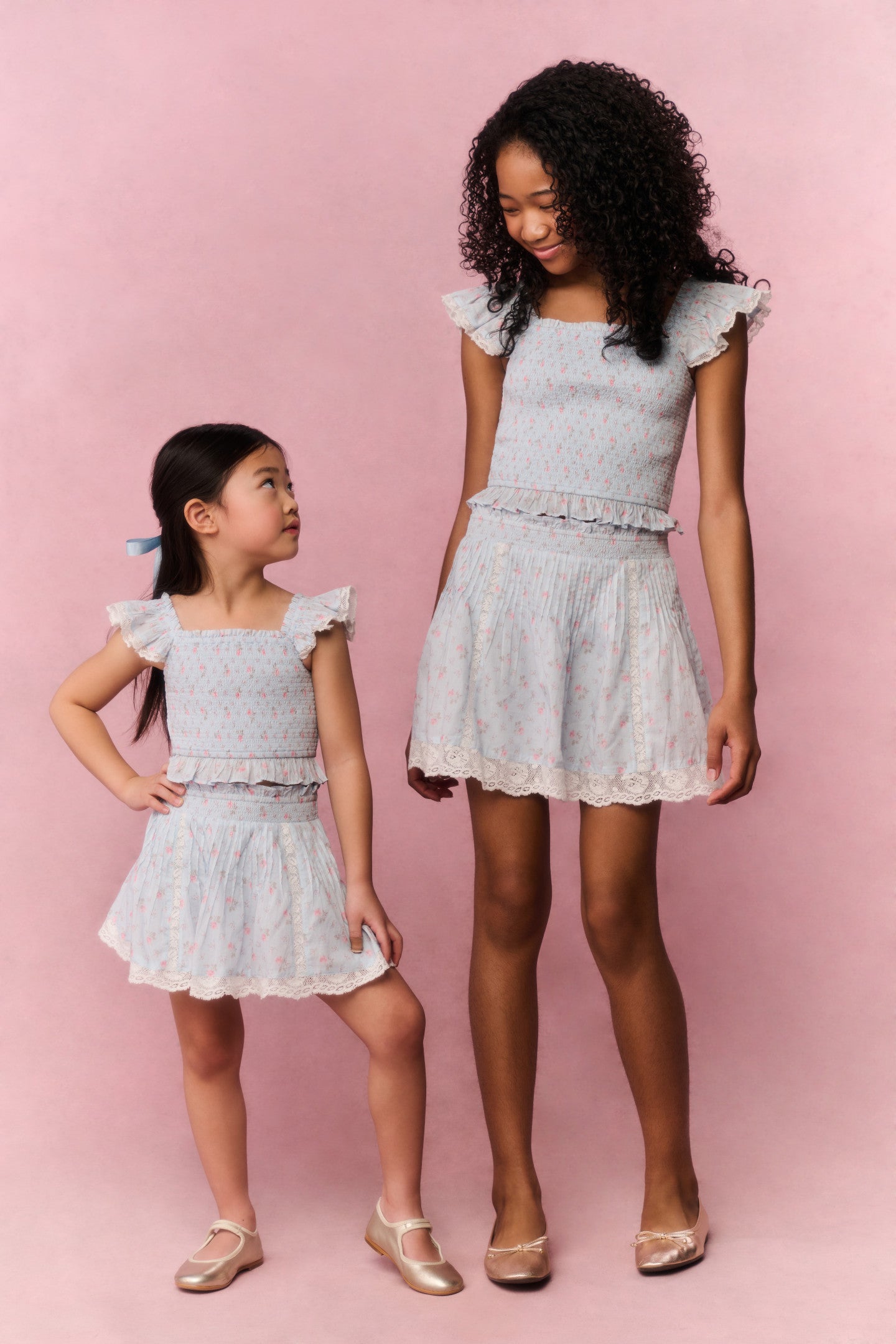 The Solena Kids’ Skirt features an A-line silhouette in lightweight floral fabric. Scalloped edges and delicate lace trim at the hem make it perfect for everyday adventures.