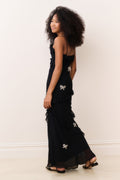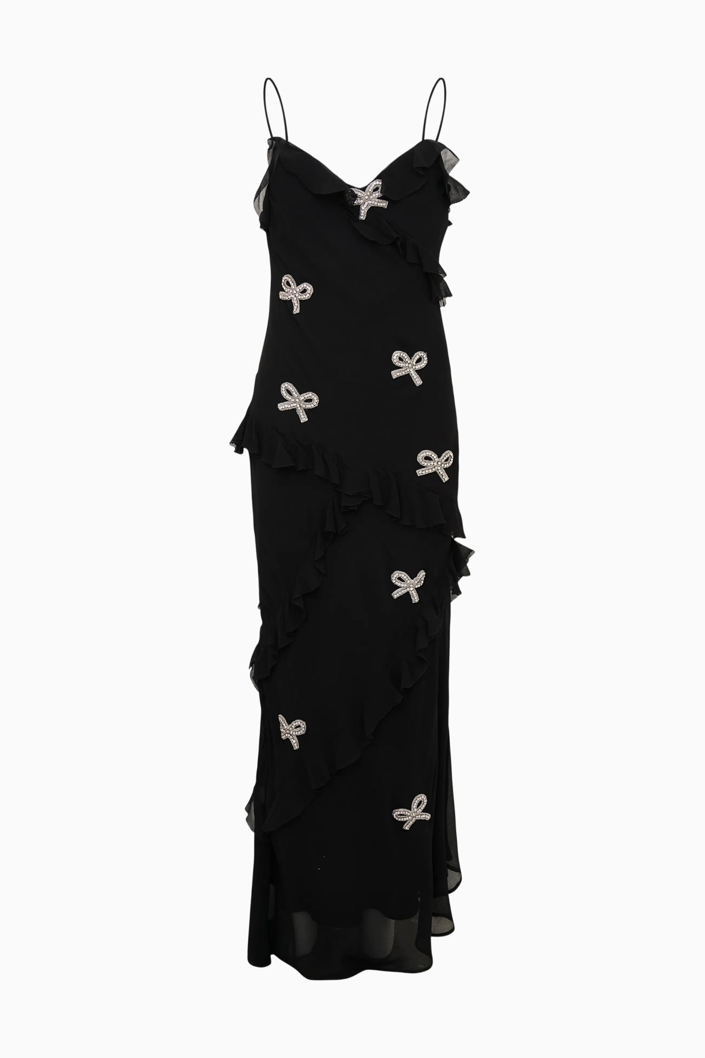 All dressed up in the Mini Rialto Dress. Our best-selling dress, but for our minis, is reimagined for the holidays with crystal-studded bows all over. She features thin spaghetti straps, a maxi length, and ruffles adorning the piece.