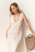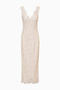 Introducing the Mira Dress. An elevated event dress this bias cut midi dress features a gorgeous jacquard with our floral luna rose bow print. The jacquard is inspired by a vintage demasque wallpaper and french textiles. This piece has scallop lace cutwork all over with careful-placed scalloped lace at the neck and waist giving it a sheer effect and wide straps.