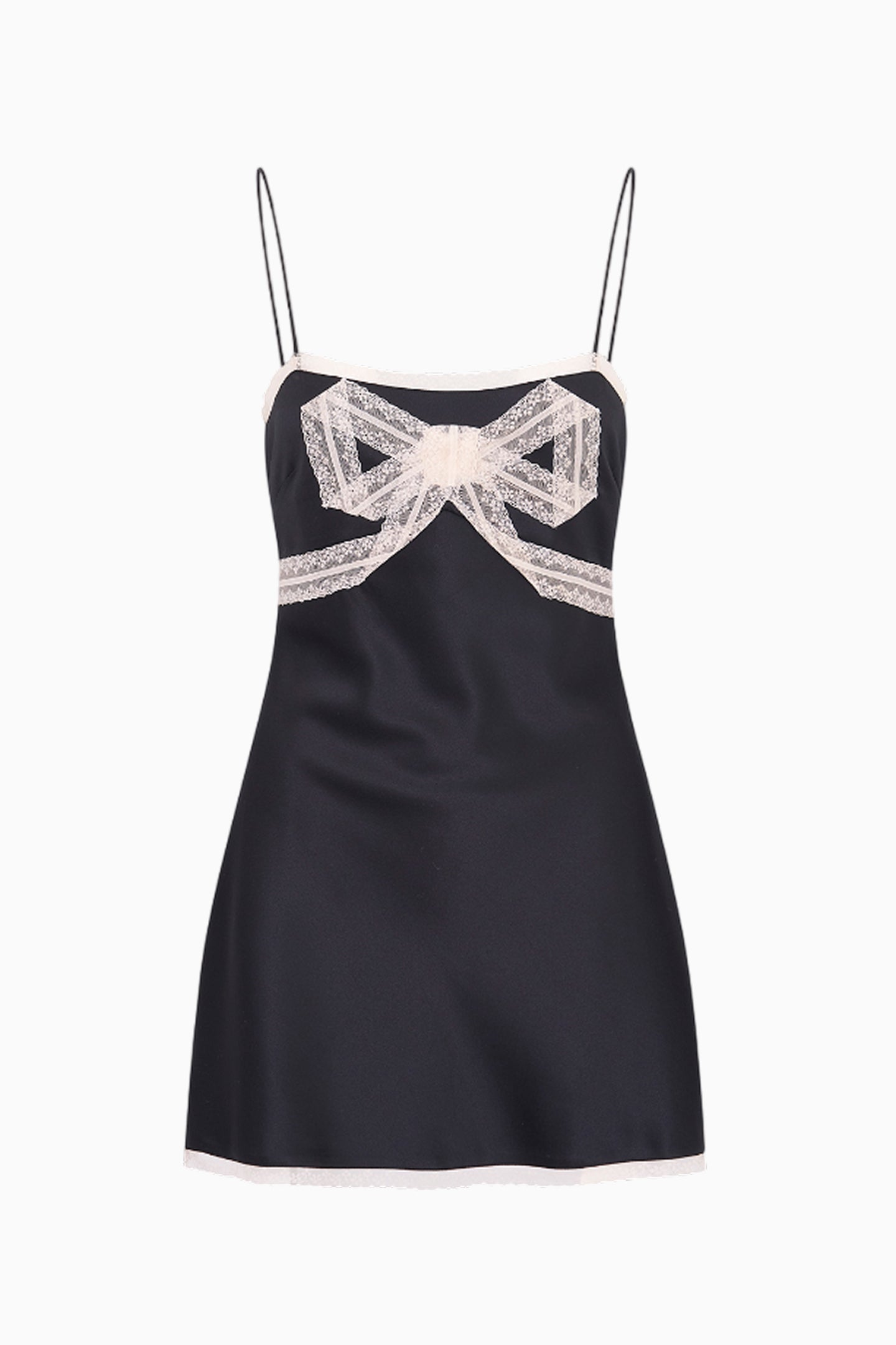 Meet the Mirelis Dress. Designed with delicate spaghetti straps and a flattering empire waist, this bias-cut silhouette skims the body for a soft, slinky feel. A dainty lace trim traces the neckline, while a sweet dancing bow adorns the front. Designed from a drapey satin-finish crepe with a subtle sheen, Mirelis is the perfect balance of flirtation and sophistication in timeless black and white.
