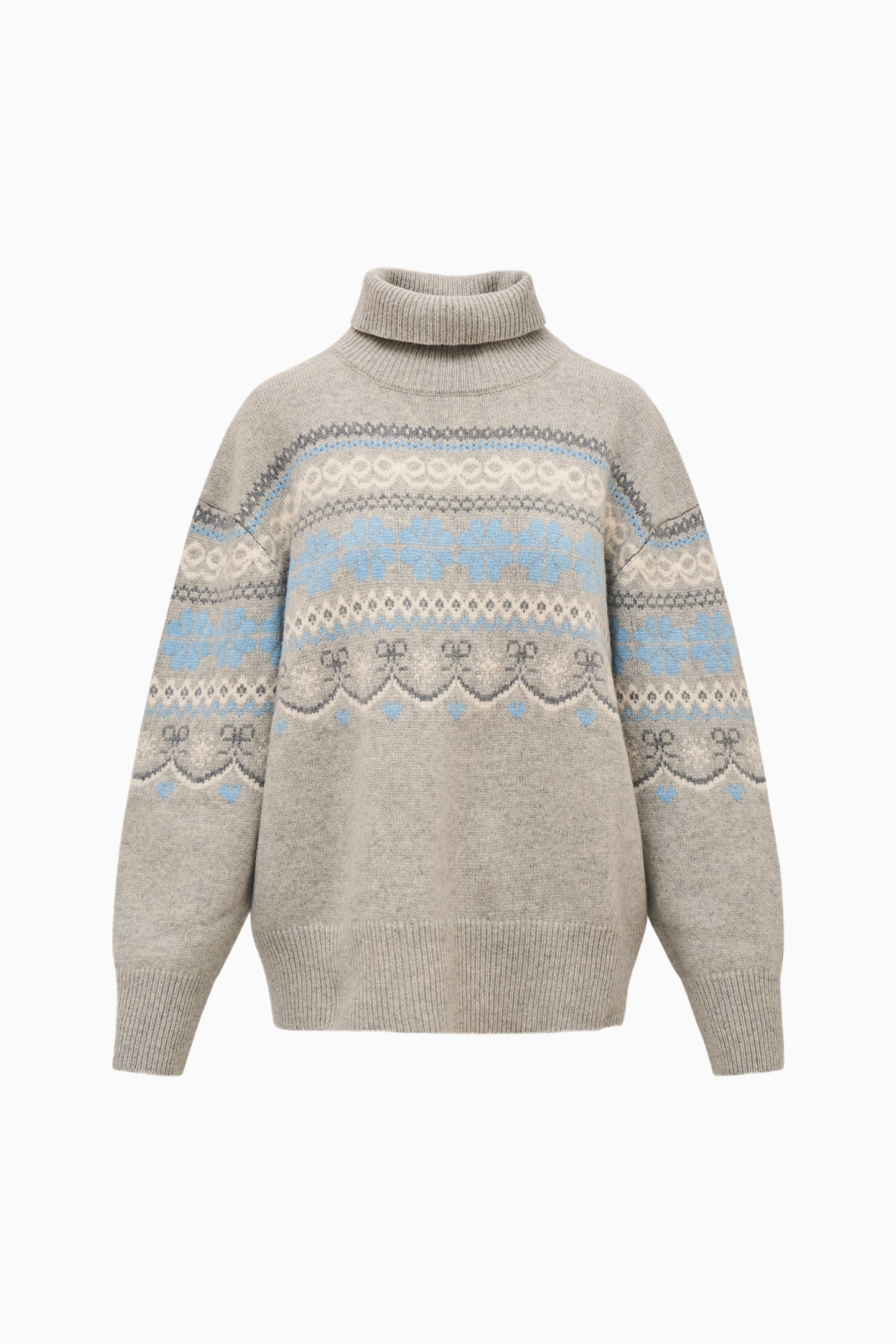 The Mirin Turtleneck is an oversized, cozy knit crafted from a warm, merino wool. Featuring a relaxed turtleneck and body, it offers warmth and softness with a classic Fairisle-inspired design—perfect for layering or wearing alone for a polished winter look.