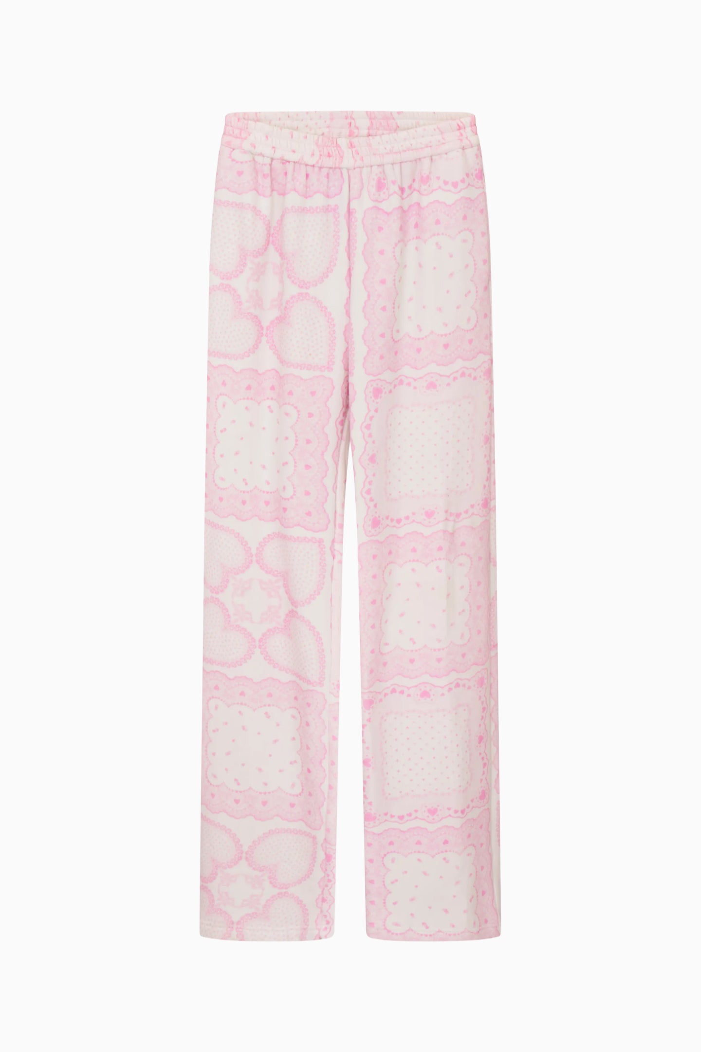 The Momo Sweatpant is a cozy, straight-leg pant crafted from soft cotton-polyester fleece with our new Mon Cheri allover heart-and-lace print. Designed with an elastic waistband for easy pull-on wear, it features pockets. Perfect for Love Day lounging or casual winter outings. Pair with the Leila Pullover for a full, cozy set.