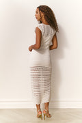 The Mora Dress debuts with a sheer, open hand-crochet fabric all over. This maxi dress has a slim, flattering fit, a wide scooped neckline, extended shoulders with cap sleeves, and placed crochet patterns striped throughout. This piece comes with a separate jersey lining slip to wear if you’d like it less sheer. This piece can be worn as a chic cover up or on its own as a dress.