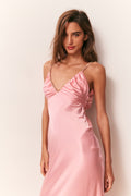 The Mystara Dress captivates with a touch of sparkle, cut in a fluid charmeuse for a slinky, luminous drape. This bias-cut maxi gown features an open V-neckline with delicate rhinestone trim tracing the straps, while soft ruching at the cups adds subtle romance. Effortless yet striking, this gown is designed to move with you, catching the light at every turn.