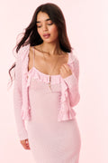 Pretty in pink in the Nilah Cardigan. This pretty knit is designed with a lightweight stretch yarn with a delicate pointelle stitch all over. The sweater has a slim-fitting silhouette that’s slightly cropped. A ruffle flounce adorns the neckline while a scallop pointelle trim cascades down the center front placket and hem. Elastic loops feature our custom faux shell buttons down the front. The piece is finished with a peplum hem.