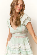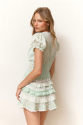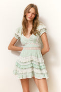 Introducing the Nivara Dress. Designed using a cotton voile fabric, this Victorian-inspired mini stuns with a pretty printed lace effect and intricate details like vintage-inspired laces stripped throughout. The dress begins with short puff sleeves, an open square neckline, smocking at back for easy pull on, and a fitted bodice that releases into a slight, handkerchief skirt, ruffle-tiered skirt.
