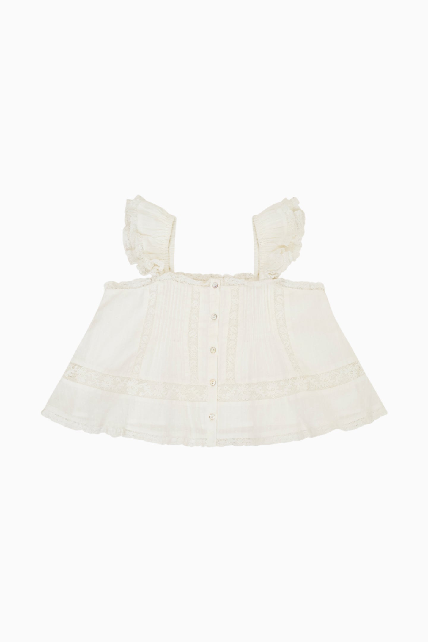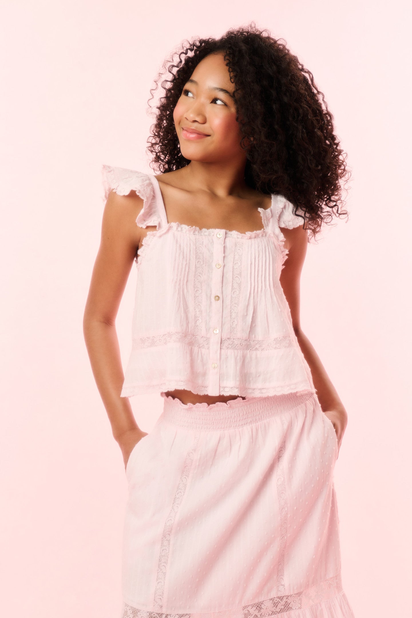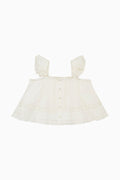 Timeless and classic, our girls are forever cute in our Norabel Top. This Victorian-inspired piece features lace trims and insets throughout, tank-like flutter sleeves, and tiny buttons down center front.