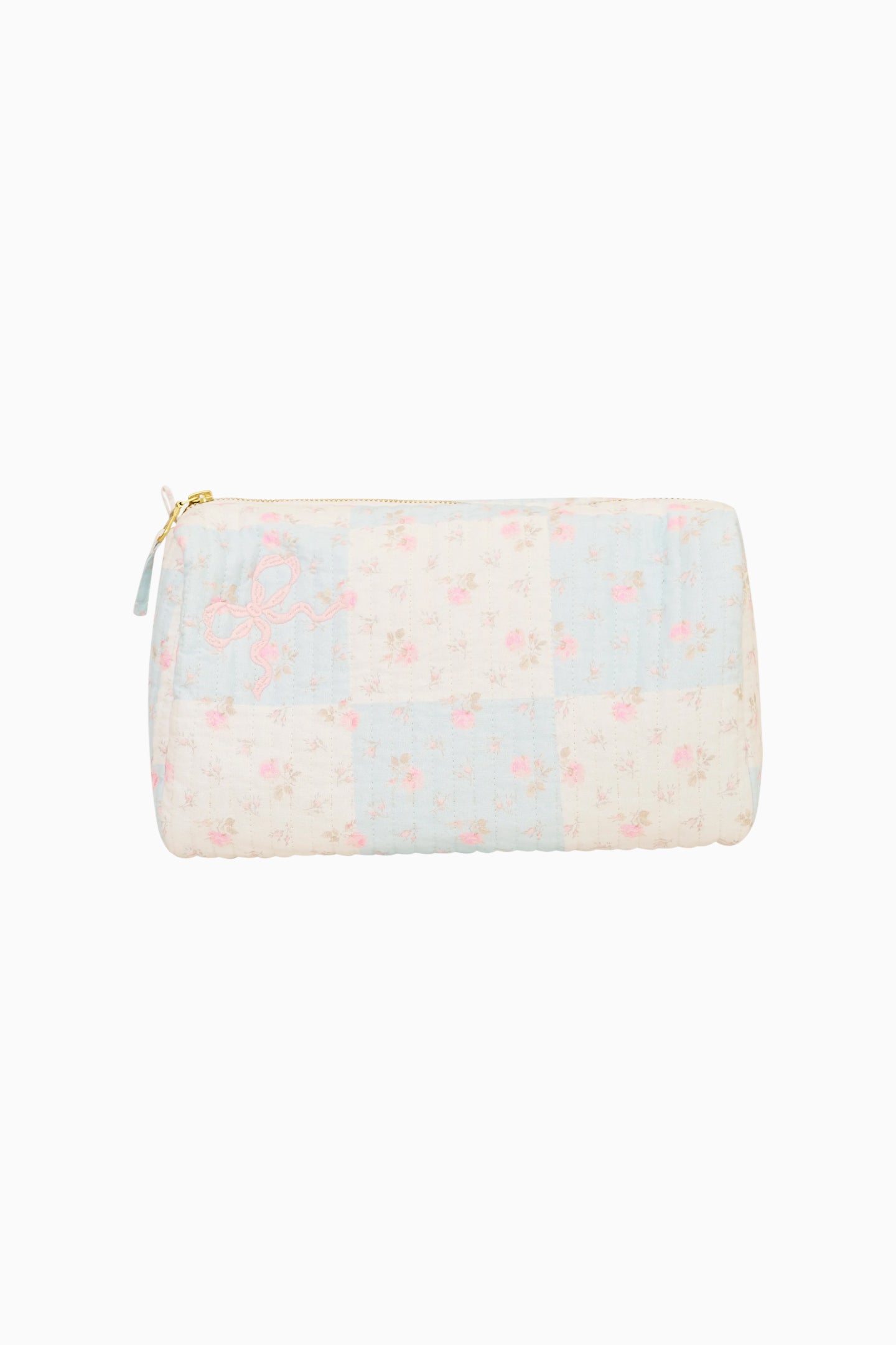 The Octavia Pouch features a structured, padded silhouette crafted from quilted cotton for a soft, tactile feel. A zipper closure with a pull tab keeps beauty essentials secure, while bow embellishment and a printed motif bring a charming, considered touch to your vanity or travel bag.