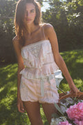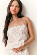 Feeling flirty in the Ondeline Cami. This Bohemian-inspired top is designed from a luxe, silk habotai fabric. With a swingy, trapeze shape, this feminine top features a lovely, drapey ruffle descending down the center front adorning a triangular elegant lace patch, and comes lined with a lightweight, polly georgette fabric.