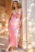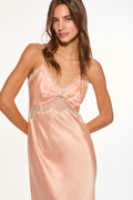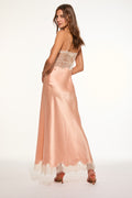 Introducing the Orianna Dress. This charming maxi dress debuts with a silk charmeuse, drapey fabric with delicate chantilly lace trims. The bias piece features thin spaghetti straps above a v-neckline with lace below the bust that falls to a body-skimming skirt with lace trimmed at the hem.