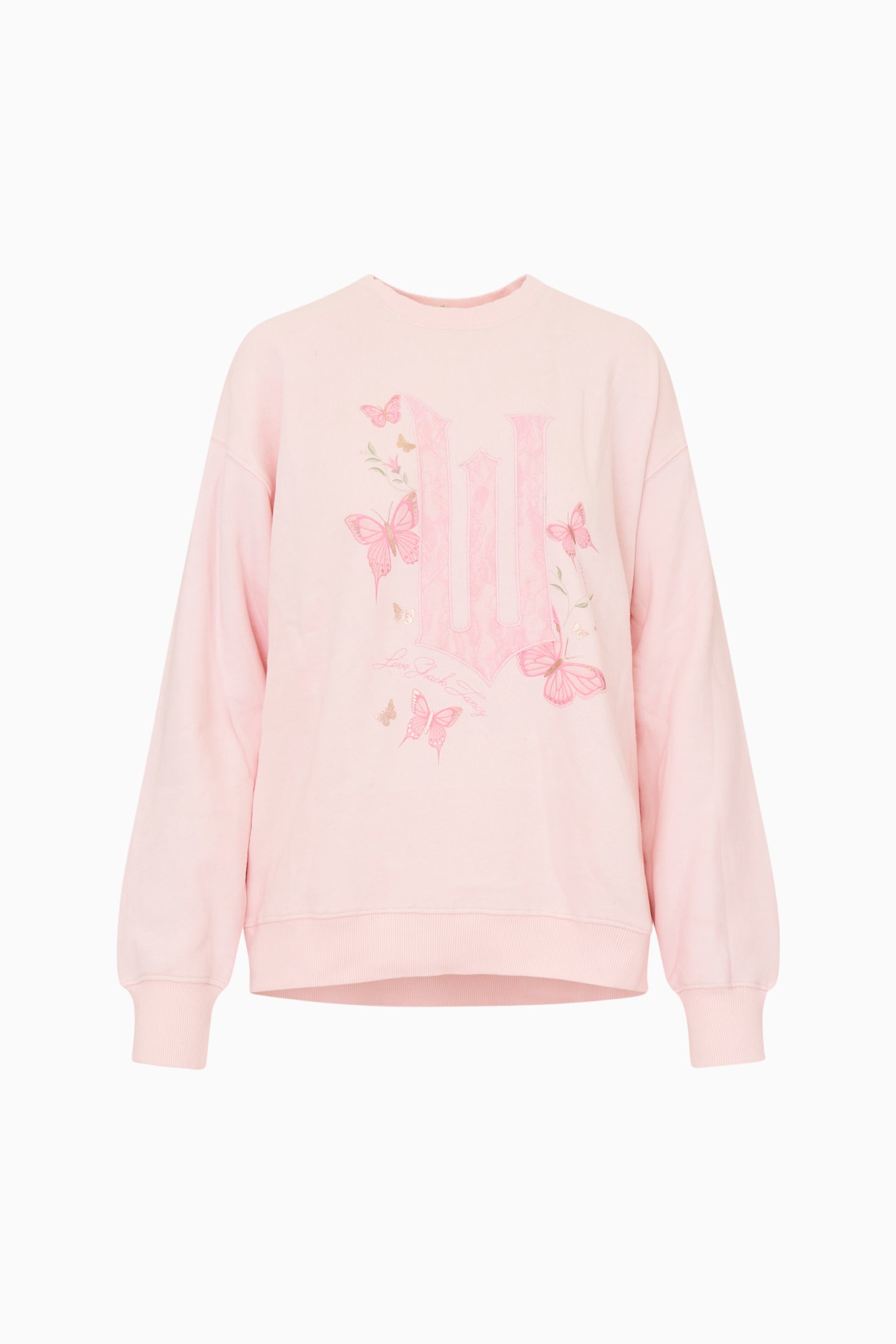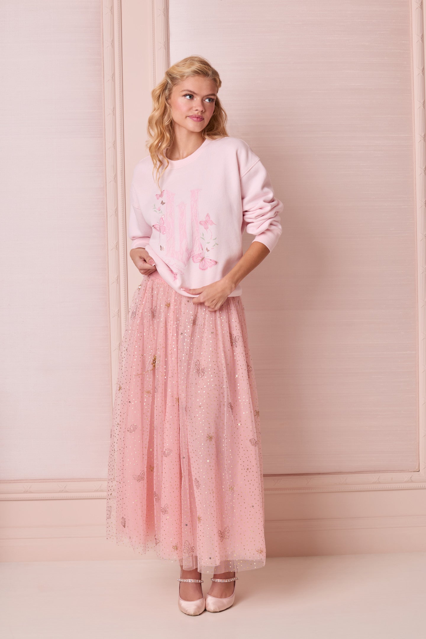 Our best-selling Palo Pullover returns as part of our limited-edition collaboration with Wicked: For Good. The pretty pink pullover features the Wicked: For Good logo with charming butterflies and tiny florals floating throughout. Extra cozy, the piece comes complete with LoveShackFancy printed on the front, ribbed cuffs, neckline, and hem.