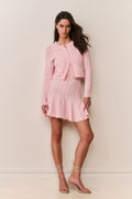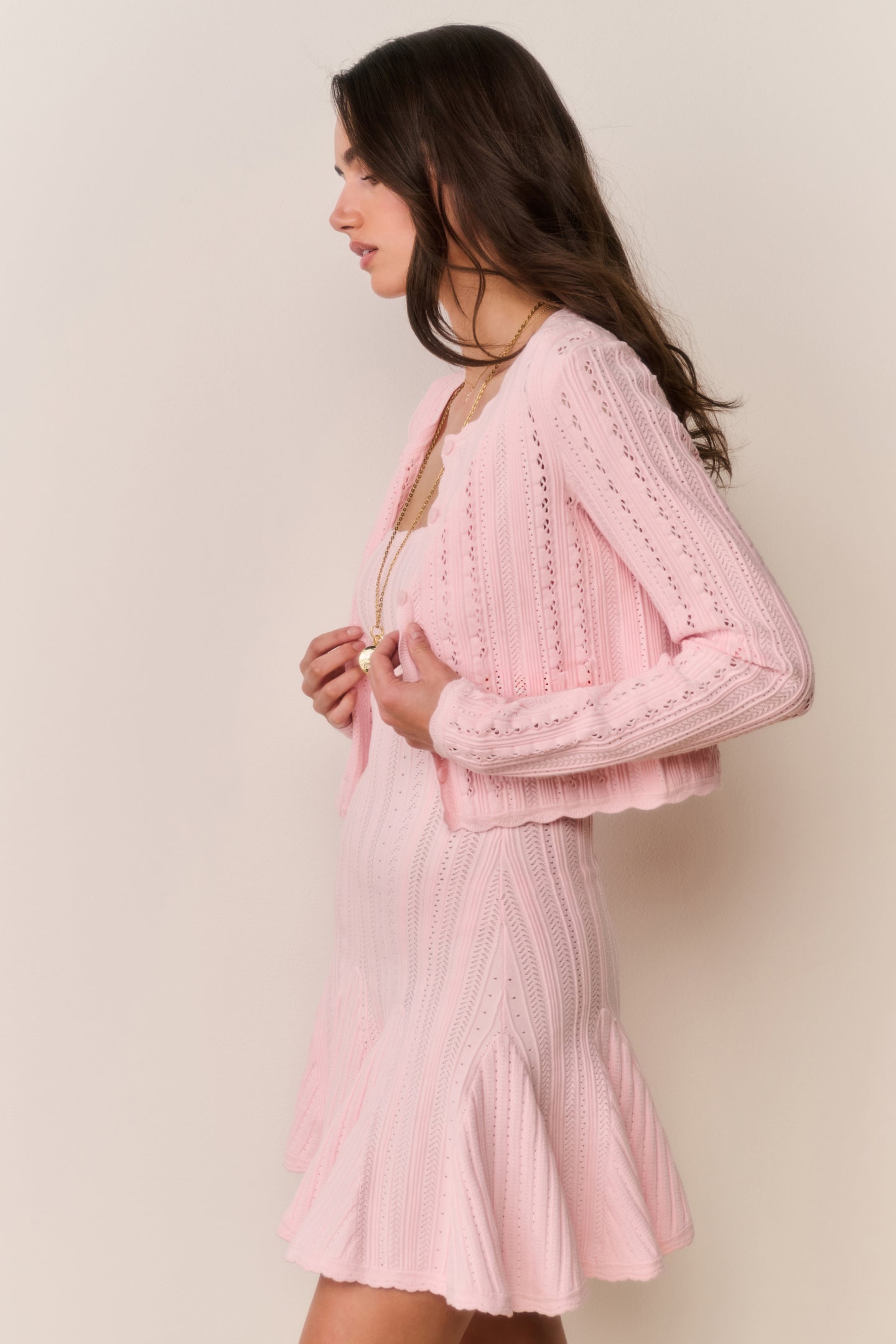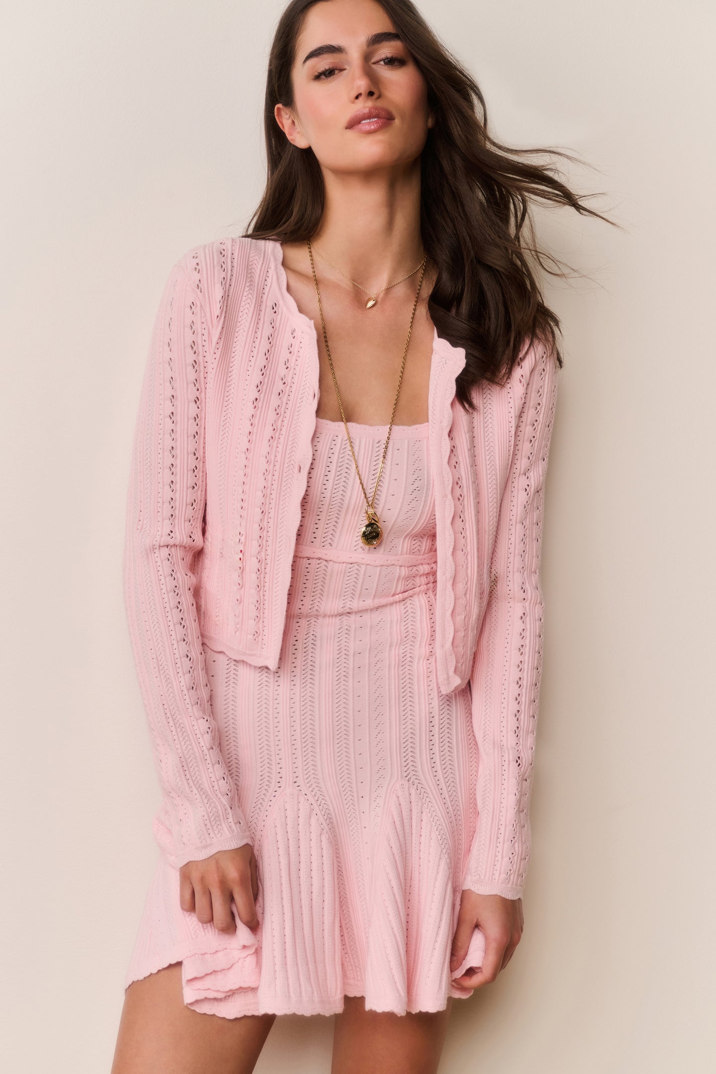 Softly knit, airy cardigan with a crew neckline and long sleeves, the Peridot Cardigan features a striped pointelle pattern and a cropped silhouette for light texture and a little charm.