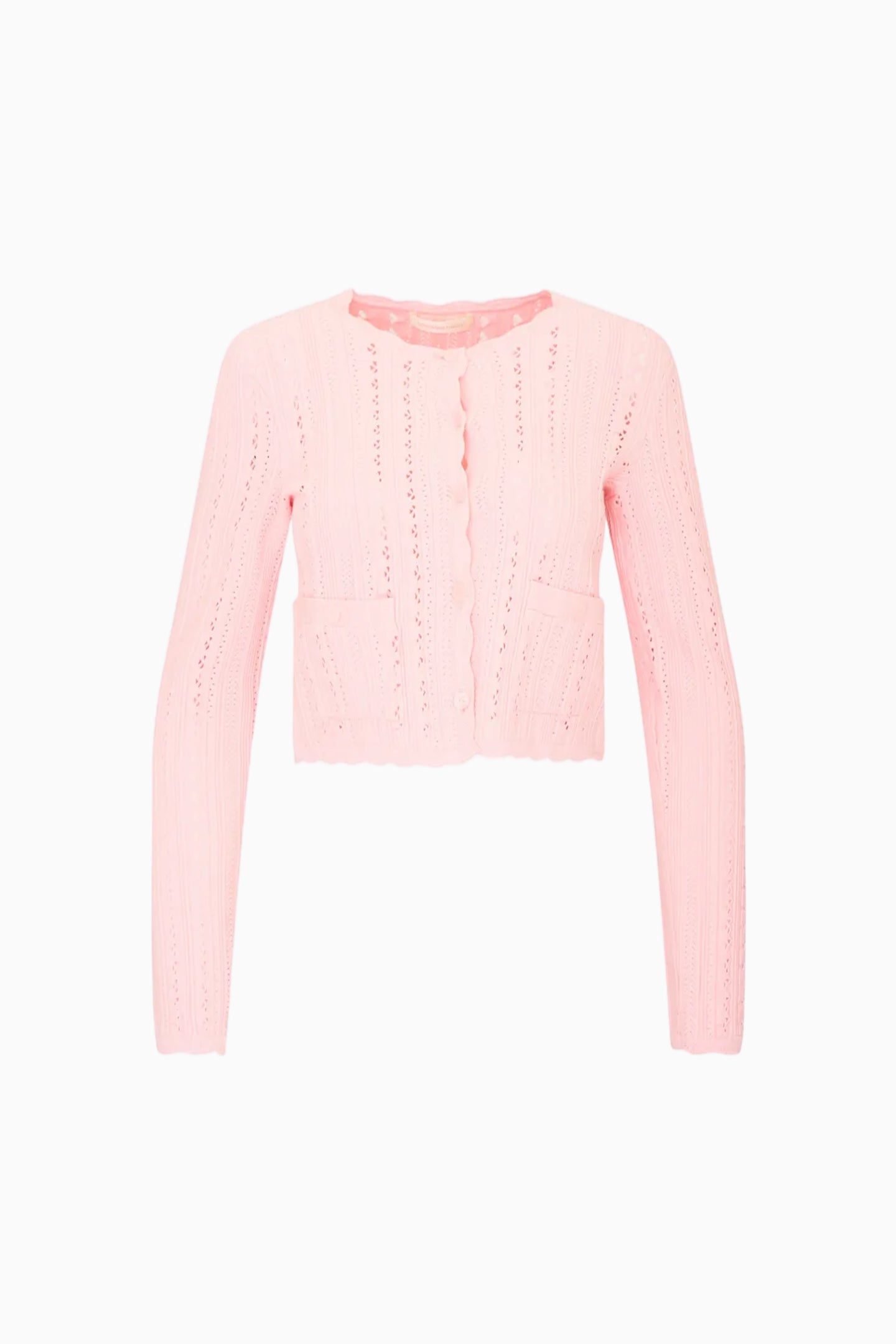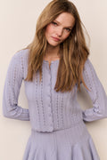 Softly knit, airy cardigan with a crew neckline and long sleeves, the Peridot Cardigan features a striped pointelle pattern and a cropped silhouette for light texture and a little charm. Finished with round center-front buttons, patch pockets, and a scalloped hem.