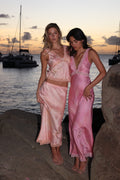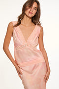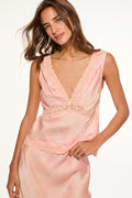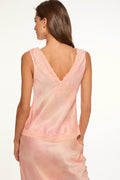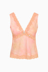 Put on the pretty with the Petrou Top. The bias cut slip cami stuns with a solid charmeuse silk blend fabric with a hand-dyed-like print all over. This easy top arrives with a v-neckline and delicate shell-and-pearl embellishments at the front adorning the vintage-inspired lace. Pair with the Aubrette Skirt for a full set.