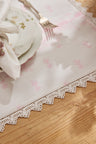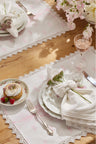 Dress up everyone’s spot at the table with this pretty printed placemat with an intricate, vintage-inspired pink print and a custom lace trim. The piece is finished with a charming scallop adornment.