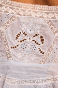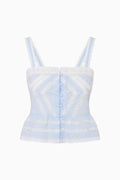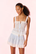 Introducing the Pruitt Top. This pretty cami is designed using an ultra-thin, lightweight cotton voile fabric that’s crisp, but delicate for the high summer season. The easy top has a straight fit with lace straps, a loop-and-button closure at the center front, a diamond arrangement of laces with delicate floral embroidery at the front, and smocking at the back. Pair with the Levant Skirt for a full set.