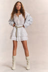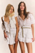 Our classic Quincy Dress is an instant staple in cotton with lofty floral sunflower embroidery and panels of inset embroidered lace. This mini frock has an inset lace yoke and functional pearlescent buttons at the center front. The sleeves—puffed at the cap, but tapered down the arm—feature bud embroidery panels and a threaded satin ribbon detail. Under a shirred elastic waistband, the skirt lets out into three pin-tucked flounces.