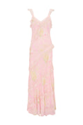 Daydreams come true in the Radiance Dress. This dreamy maxi returns with a mixed printed chiffon fabric featuring large-scale ikat florals. With an airy and breezy silhouette, the dress is stripped with delicate laces all over sourced from vintage textiles. The pieces begin with lace straps that fall to tiny flutter sleeves that fall to an easy skirt with tiny ruffle details all over.