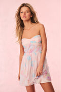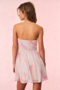 Introducing the Rayne Dress. This strapless mini dress stuns with a viscose chiffon fabric featuring various mixed prints with ruching going in different directions and cascading drapes creating a gorgeous texture on the bodice. The A-line skirt is airy with slight pleats flowing throughout. This piece is finished with a zipper at the bodice.