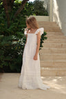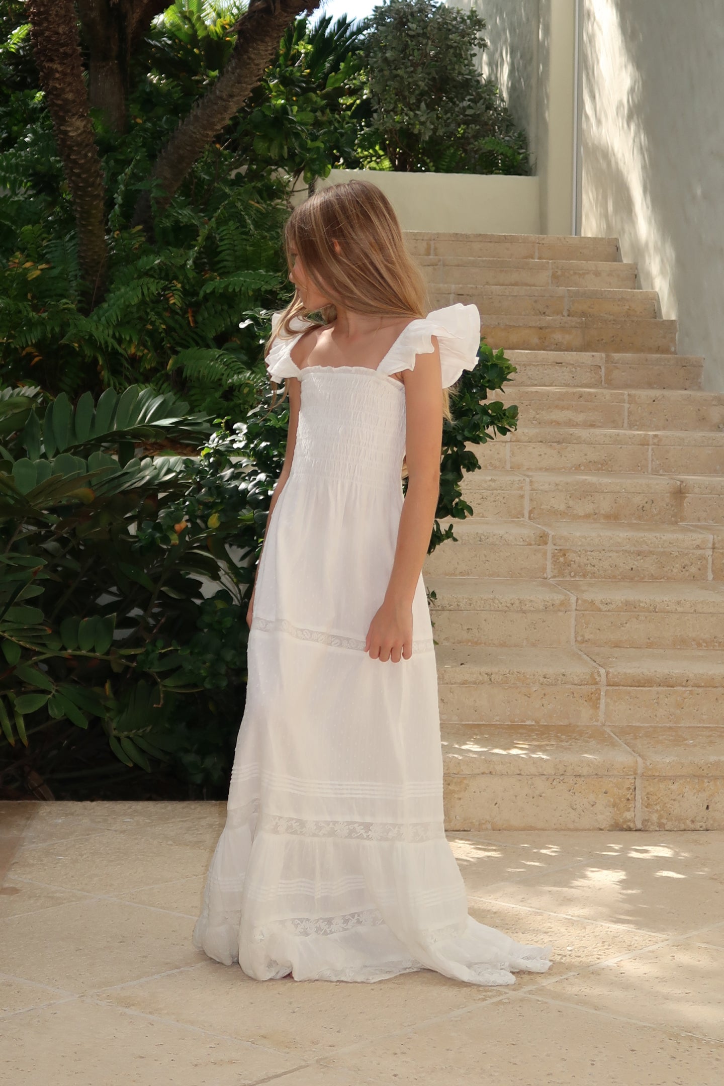 Introducing the Rhiannon Dress. This easy frock features tiny flutter sleeves, a square neckline, lace trims throughout, and an airy, flowy silhouette.