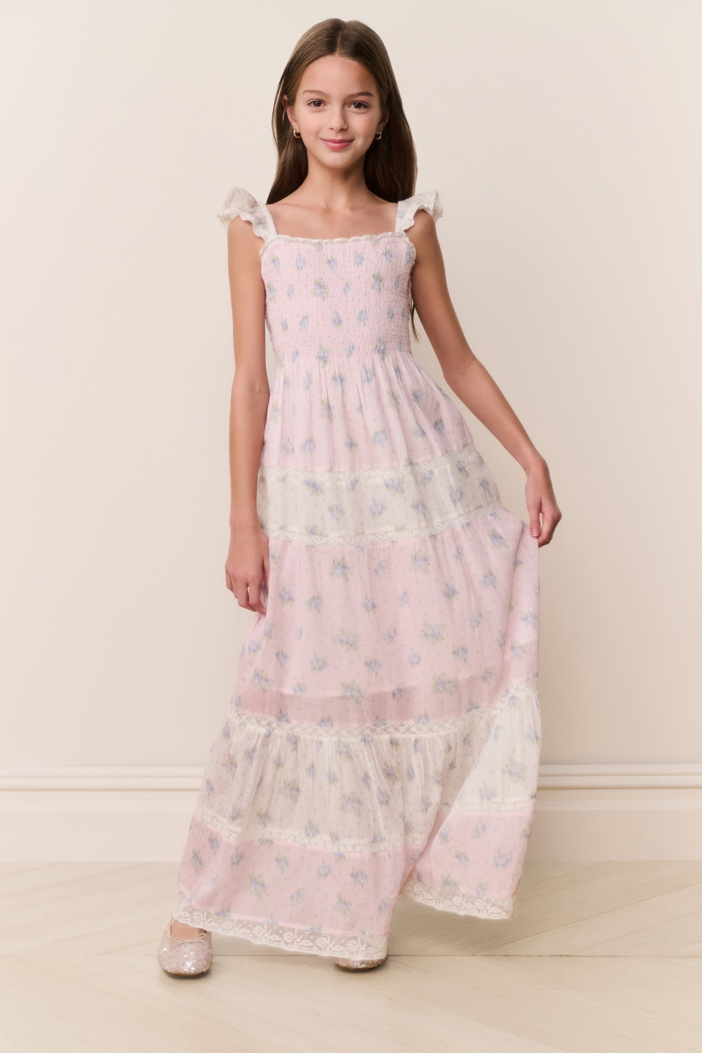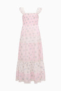 Introducing the Rhiannon Dress. This easy frock features tiny flutter sleeves, a square neckline, lace trims throughout, and an airy, flowy silhouette.