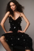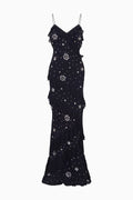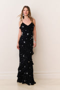Our best-selling Rialto Dress returns for the holidays in a shimmering, lightweight nylon chiffon detailed with hand-beaded rhinestones and sequins. The design stays true to the original silhouette: thin spaghetti straps, slightly fitted through the body, and a side-seam zipper for closure. Here, the overlapping, asymmetrical ruffles cascade from the neckline down through the skirt, giving it movement and drama.