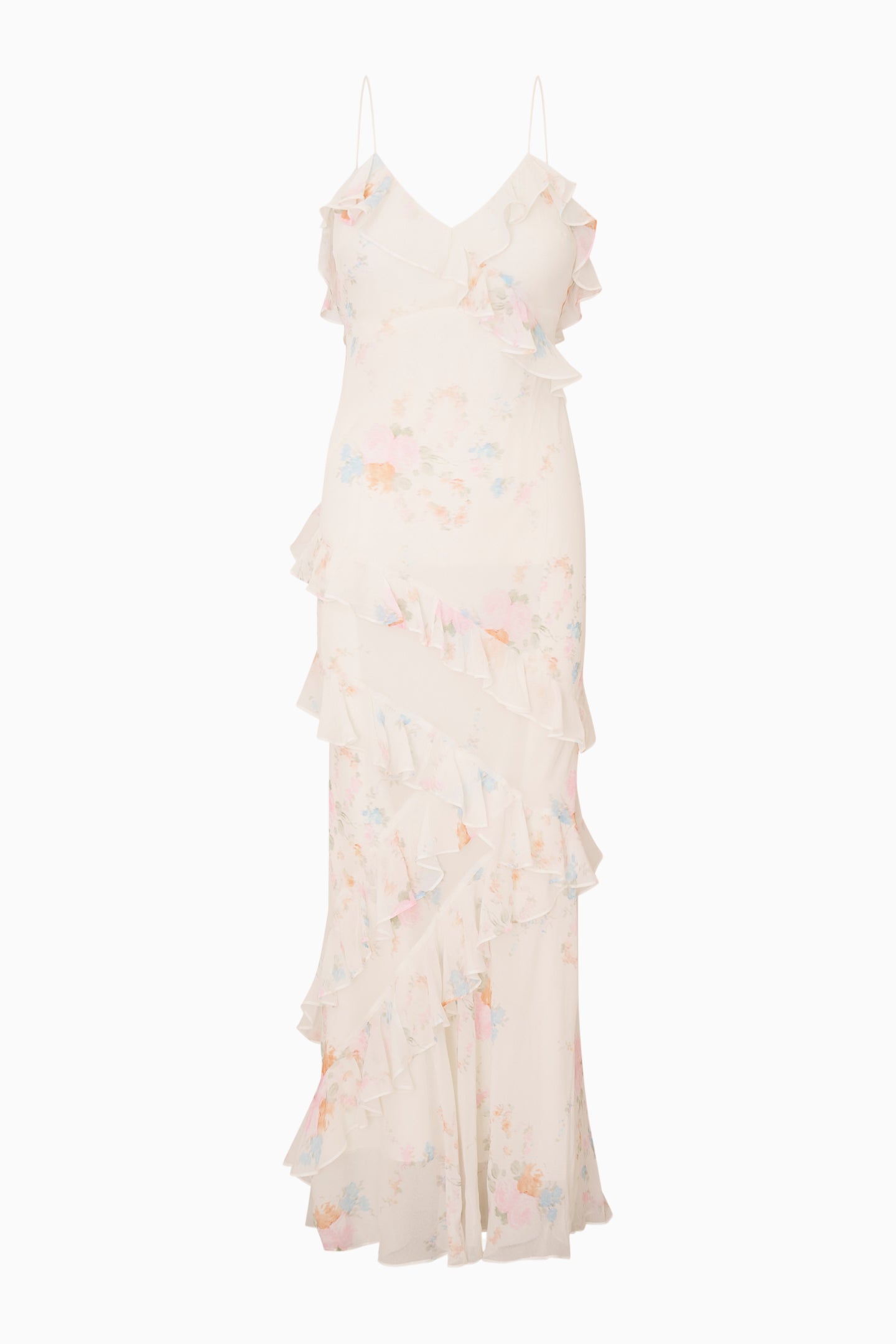 The Rialto Dress has a fitted silhouette with a romantic plunge neckline framed by delicate spaghetti straps. Cascading asymmetrical ruffles flow from the neckline adding beautiful texture and movement. It’s a dreamy choice for evening celebrations or sun-drenched days.